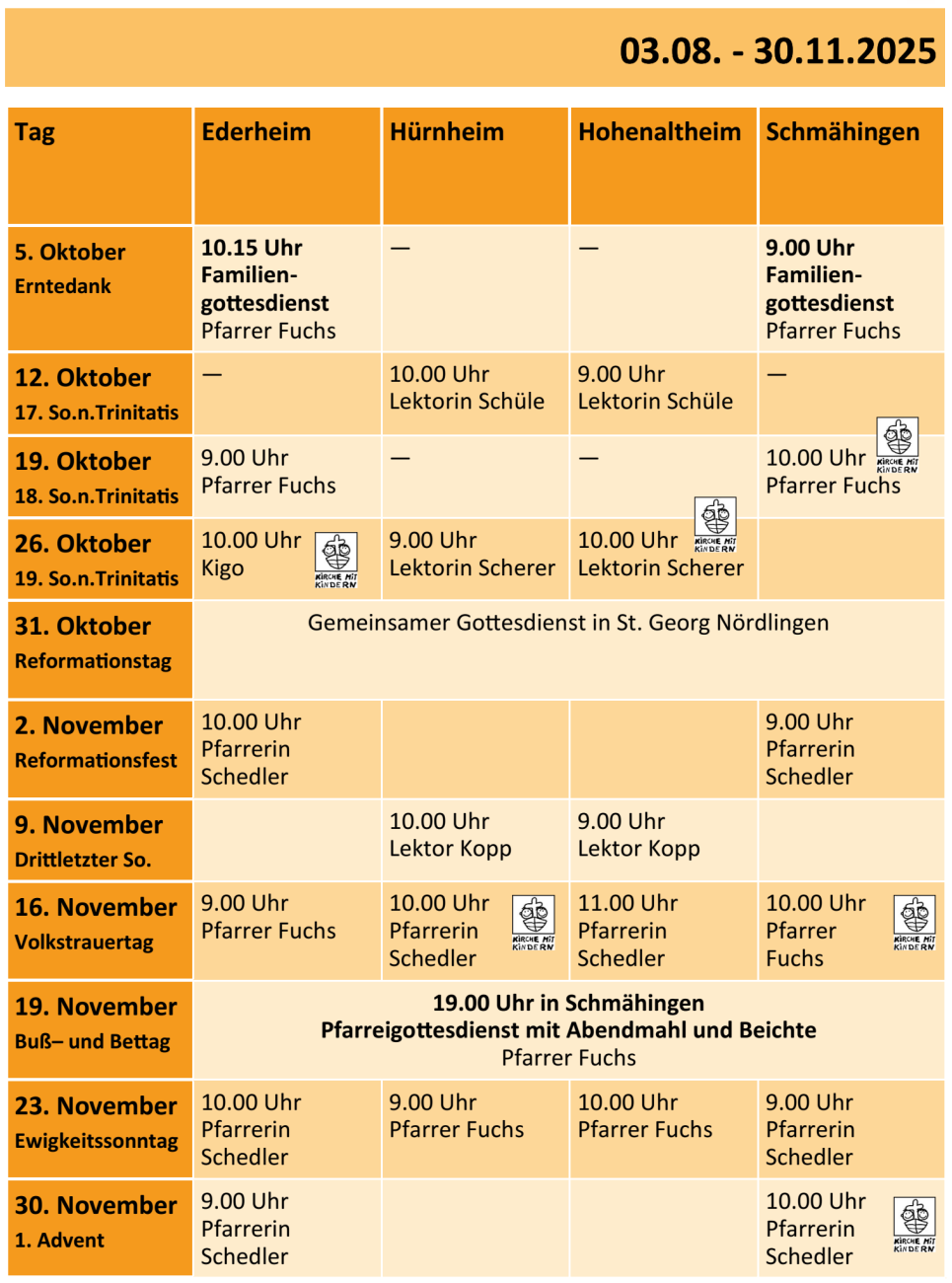 Hier finden Sie den aktuellen Gottesdienstplan der vier Kirchgemeinden bis November 2025.
